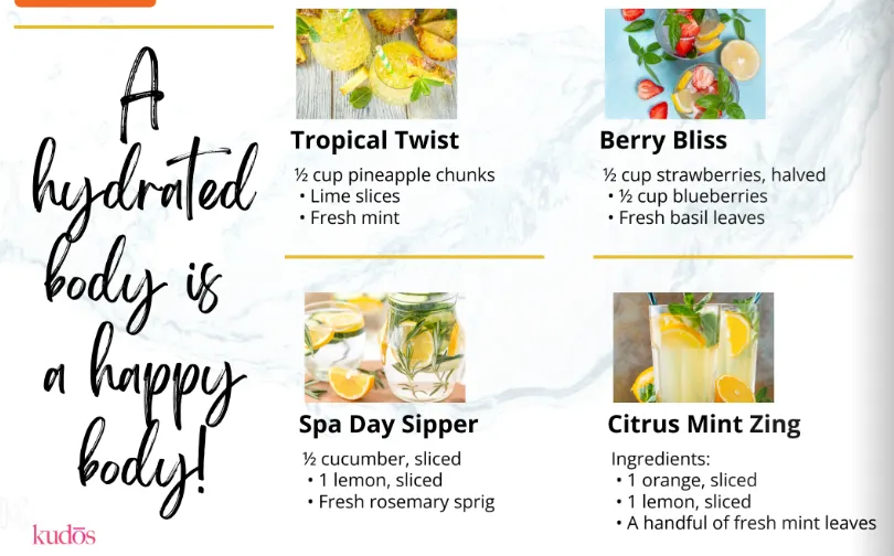 Fresh fruits and vegetables, such as watermelon, cucumbers, strawberries, and lettuce, have a high water content. Snack on them often for a tasty hydration boost.